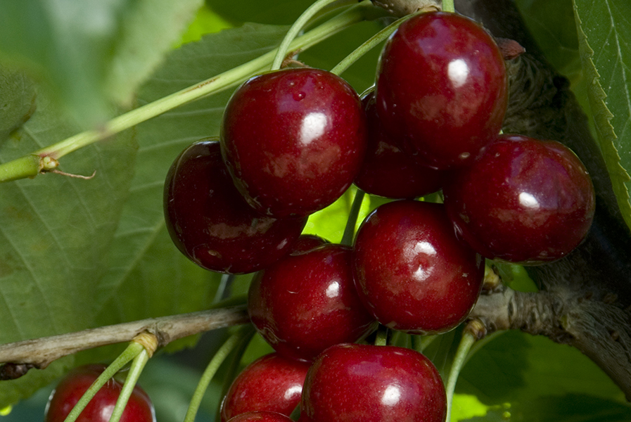 Large, firm, juicy, sweet cherry, nearly black when ripe. Has superb flavor, the number one cherry. Ripens late May to mid June. Large, vigorous tree. Zones 5 to 9. 700 hrs. Pollenized by Black Tartarian, Lapins, Van, Rainier, also Stella in colder climates. Available on Mazz.