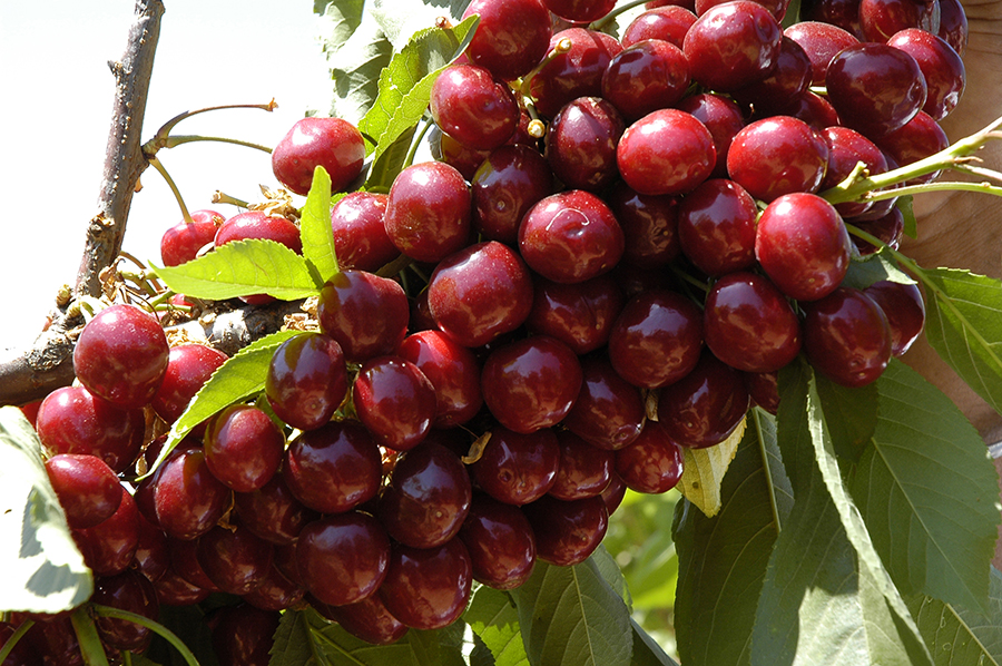 Self-fruitful cherry from Canada. Large, firm, dark red sweet cherry with good flavor. Fruit not prone to splitting. Ripens in early June, 4 days after Bing. Zones 5 to 9. 500 hours or less. Self-fruitful; good pollenizer for other cherries. Available on Mazz.