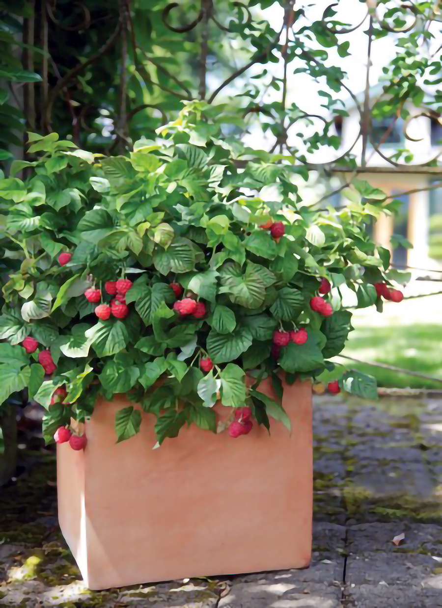 Thornless, compact bush to two to three feet, perfect for pots. Dense growth. Abundant crop of sweet berries in mid summer.