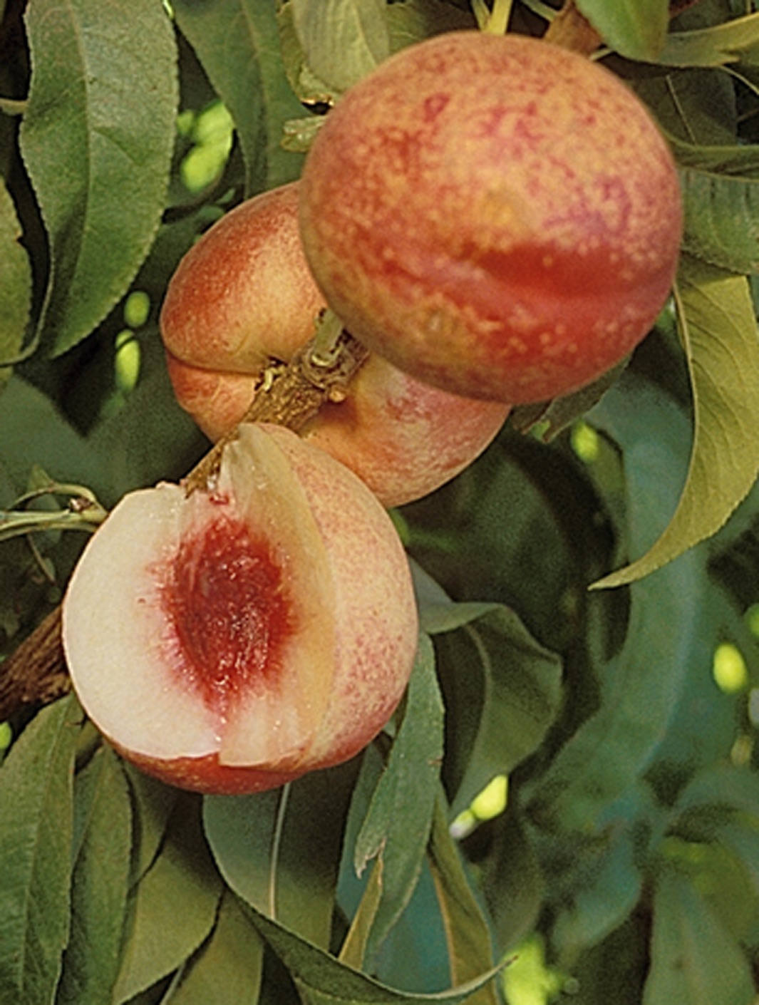 Taste test winner. One of the best of the low acid, white fleshed nectarines. Fruit has rich flavor and firm texture in early season, is very sweet when soft ripe. Large freestone to semi-freestone fruit has red and creamy white skin. Harvest mid to late August in Central California, after Arctic Queen white nectarine. Zones 6 to 9. Estimated chilling requirement 700-800 hrs. Self-fruitful. Pat No. 10174 (Zaiger). Available on Nema.