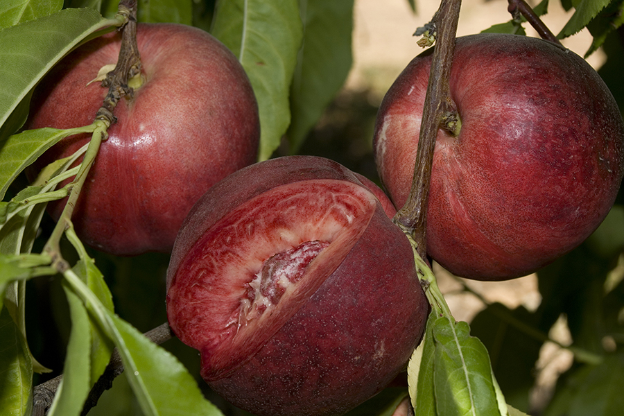 Exciting sprightly sweet, early season white nectarine. High scoring in taste tests; nice balance of sugar and acid with very appealing flavor. Has red skin and very unusual crimson streaked white clingstone flesh. Highly recommended for home orchards. Ripens late June/early July. Zones 6 to 9. 400-500 hrs. Self-fruitful. Pat. No. 7884 (Zaiger). Available on Cit.