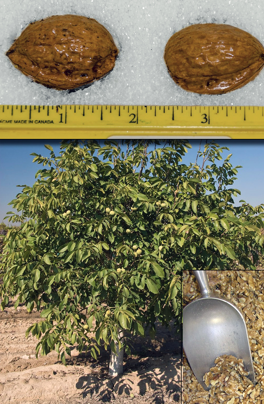 Last English walnut to leaf out, less susceptible to spring frost damage. Very large tree, excellent shade. Fair production of well sealed, thin shelled, high quality nuts. Ripens late, in October. Zones 5 to 8. 700 hrs. Partially self-fruitful. Pollenize with Hartley or Chandler. Available on Para. WE ARE SORRY, BUT WE CAN NO LONGER SHIP WALNUTS TO MISSOURI.