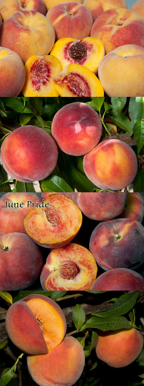 Four of the following five varieties grafted onto one tree: May Pride, Mid-Pride, Eva's Pride, June Pride, August Pride. Available on Nemaguard.
