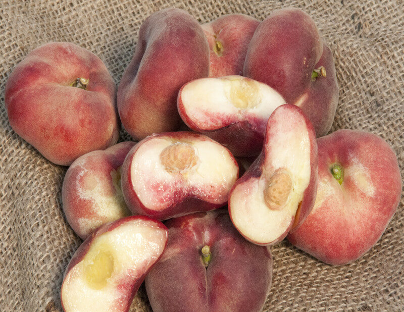 A new donut peach from Zaiger, this one has beautiful white flesh with red marbling. The clingstone fruit is medium sized with wonderful flavor that will keep you wanting more. Ripens mid to late May, Zones 7 to 9. 400 hours. Self-fruitful. Available on Nema.