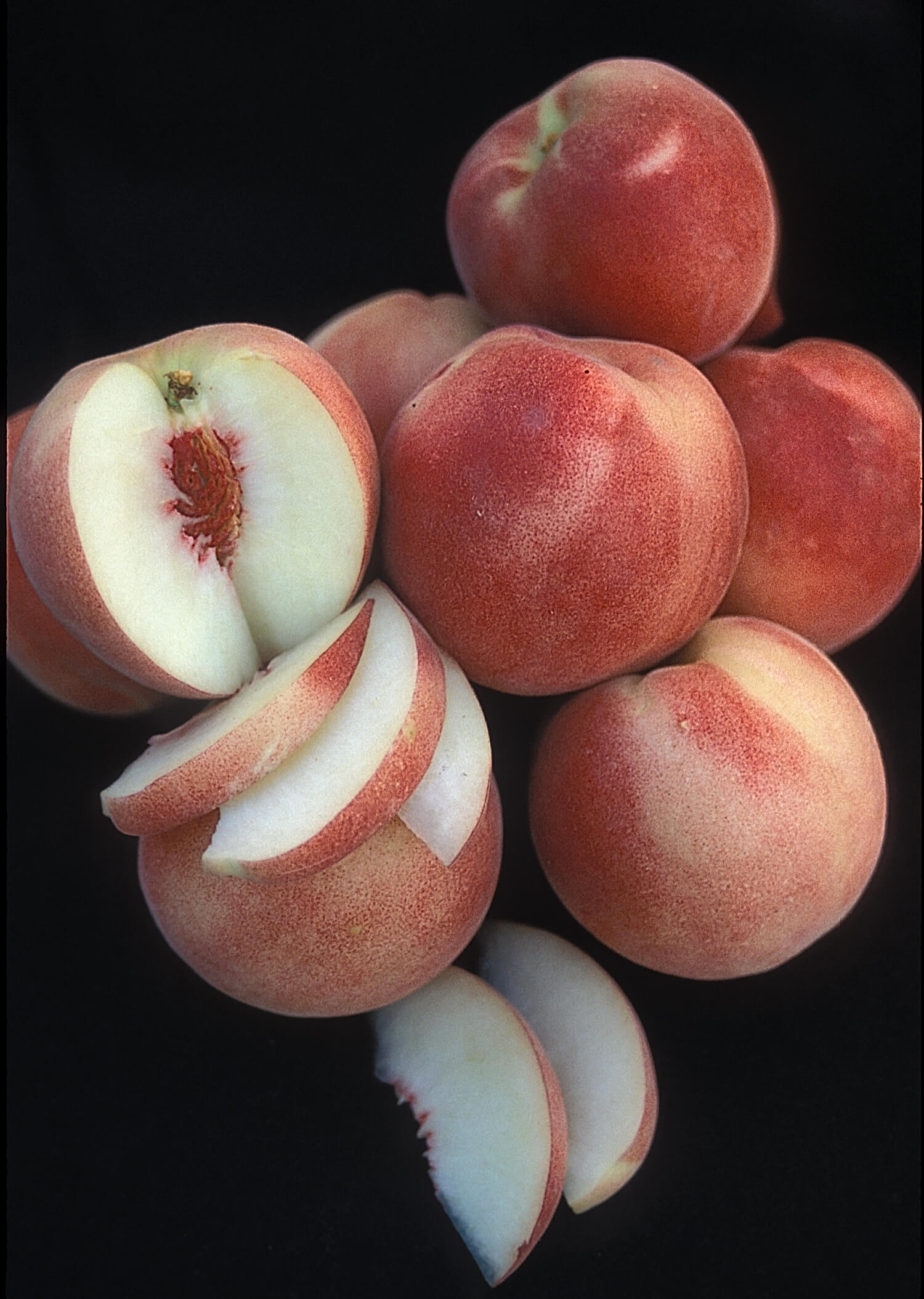 Among the best of the low acid, high sugar, fresh market white fleshed peaches. Red skinned fruits are medium to large, very firm, freestone. Has the best track record of any of the Zaiger white fleshed peaches for producing well in a variety of climates, including the eastern U.S. Ripens mid July in central California, about one week ahead of Sugar Lady. Zones 5 to 9. 800 hrs. Self-fruitful. Pat. No. 5821 (Zaiger). Available on Lov.