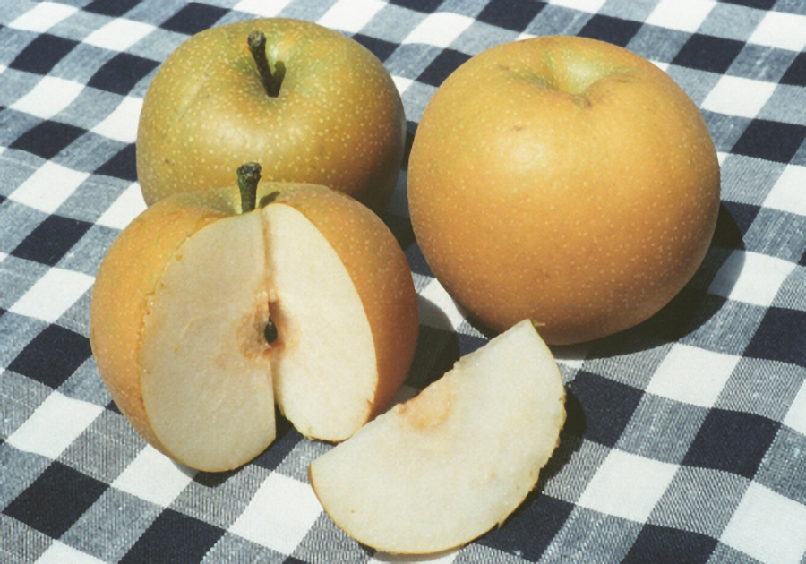Medium sized Asian pear with thick, russetted, golden brown skin. Aromatic, crisp, firm, with very sweet flavor. Late bloom. Resistant to alternaria, black spot, scab. Ripens in mid August with heavy yields. Zones 5 to 9. 450 hours. Pollenized by Hosui, Shinko or other pear. Available on Bet.