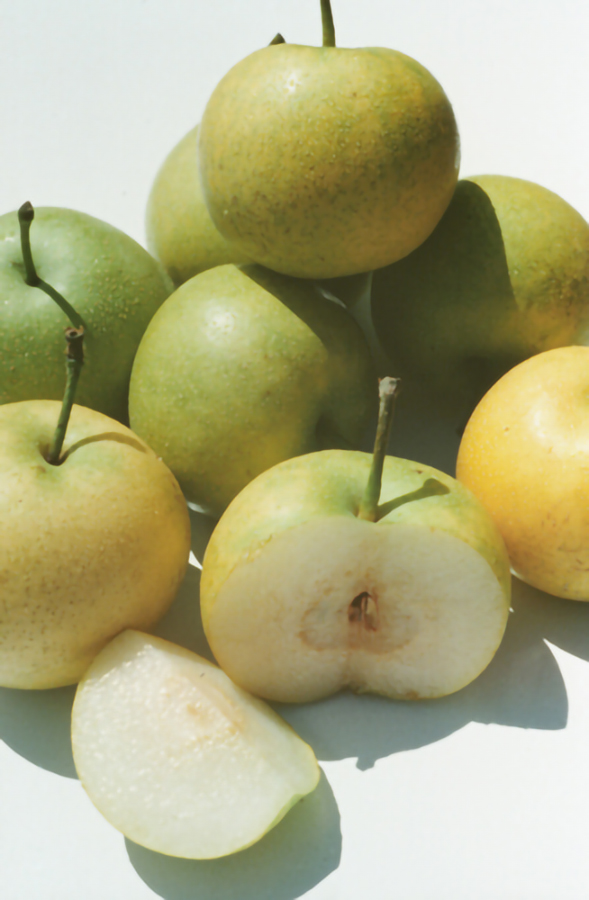 Medium sized, juicy, sweet, crisp Asian pear with smooth, greenish yellow skin. Superb fresh eating, one of the best. Easy to grow. High yields, keeps well. Blooms late. Ripens mid August. Resistant to fireblight. Zones 5 to 9. 450 hours. Partly self-fruitful or pollenized by Ishiiwase, 20th Century or other. Available on Bet.