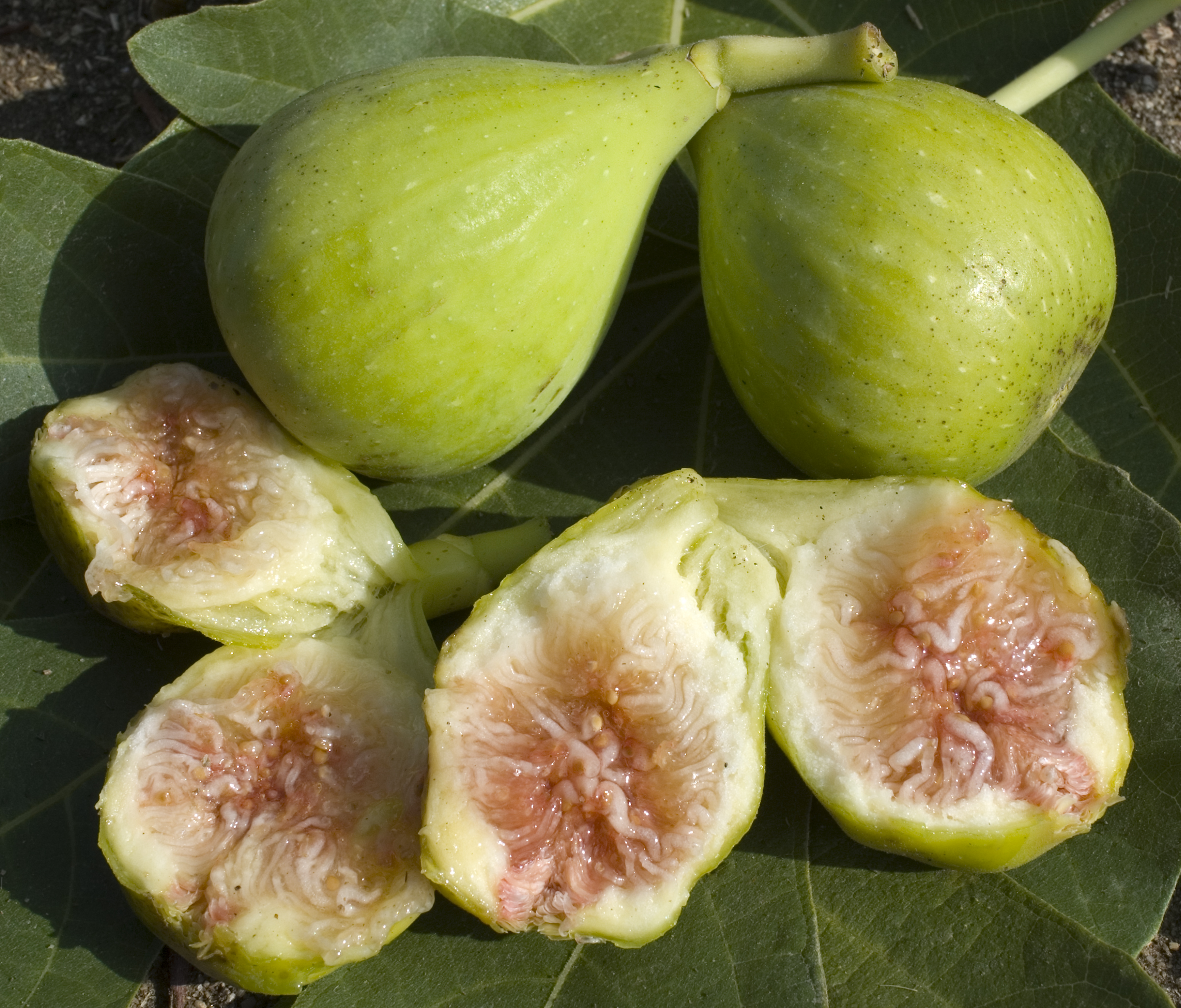 Light greenish yellow skin, pink flesh. Flavorful fig; not as sweet as Kadota, but resists spoilage. Use fresh/dried. Very vigorous, long-lived tree. Heavy crops coast or inland. Zones 7 to 9. 100 hrs. Self-fruitful. NOTE: Due to their sensitivity, figs are NOT guaranteed.