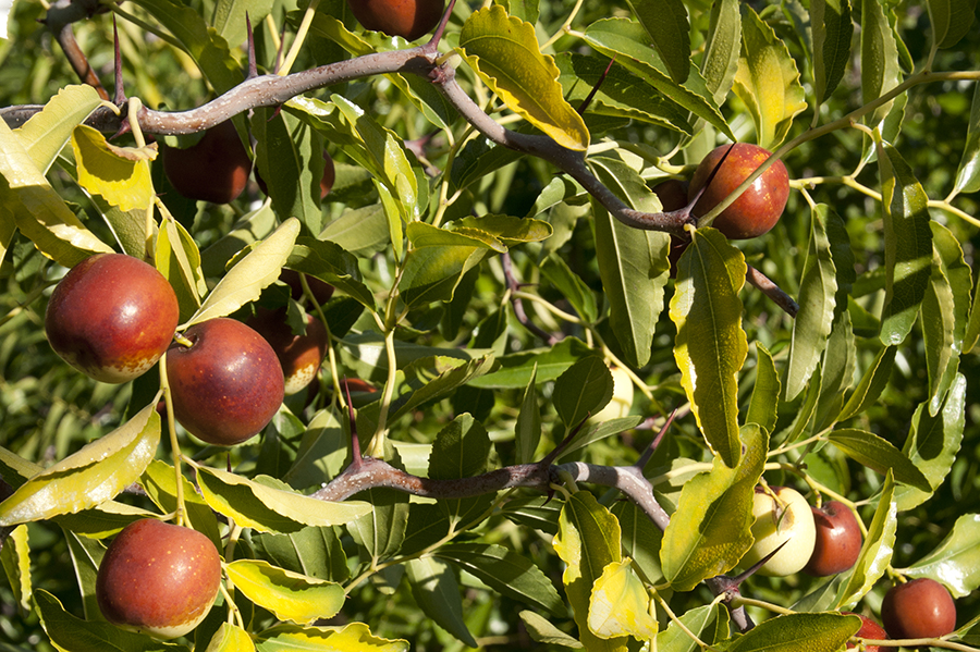Rogue form of jujube from the orchards of Dave Wilson Nursery. Contorted, twisted shape with fruit similar to Li. Zones 5 to 10. 150 hours. Party self-fruitful; heavier set with pollenizer.