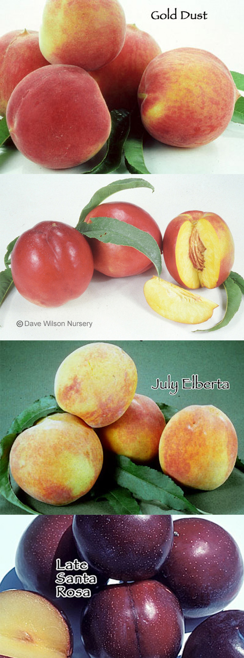 Four of the following five varieties grafted onto one tree: Late Santa Rosa plum, July Elberta peach, Blenheim apricot, Gold Dust peach, Independence nectarine. Available on Lovell.