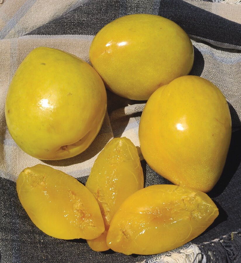 Popular, extra large, oblong yellow dessert plum. Skin is golden amber, waxy and thin, with a tender texture. Flesh is amber, firm, sweet, juicy with excellent flavor and very small pit. Ripens evenly. Great eating quality both fresh and dried and good keeping quality. Ripens in August. Self-fruitful. Pat. No. 4977. Zones 5 to 9. 400 hours or less. Available on Myro.
