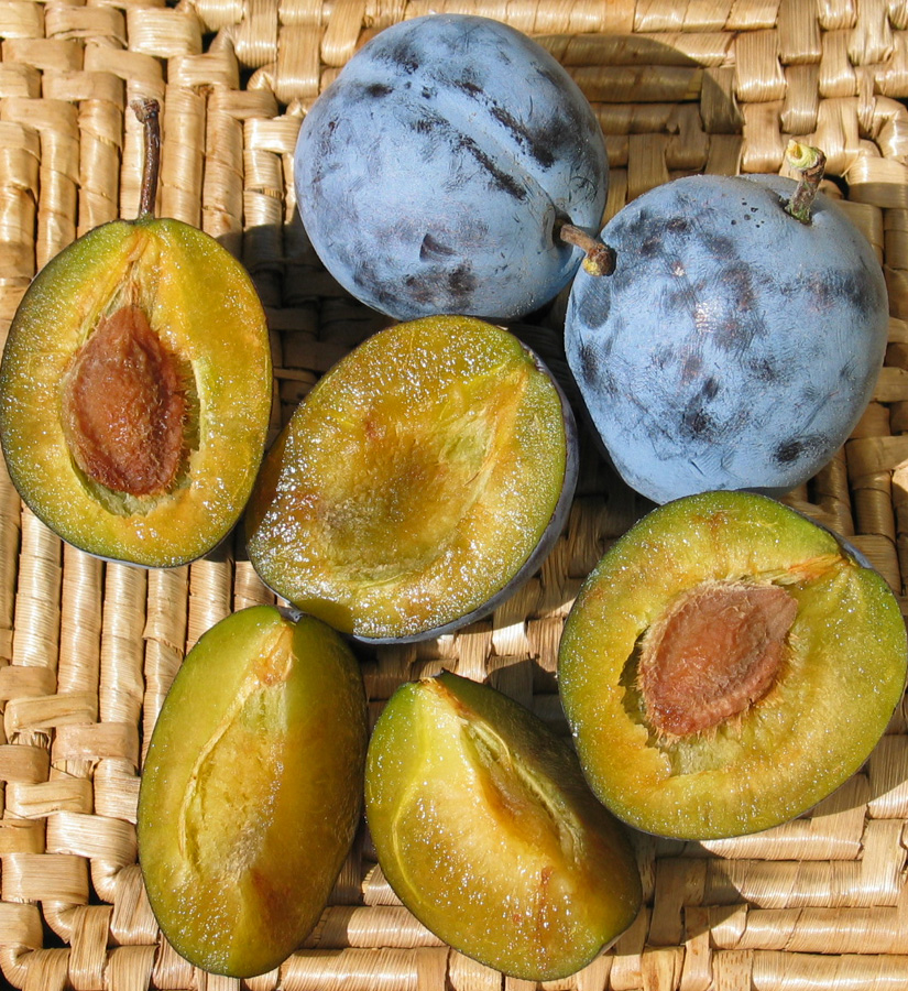 Large, purple skinned freestone prune with rich flavor; very sweet when fully ripe. Used fresh, dried, canned. Vigorous, cold hardy tree with late bloom. Late August/early September harvest. Zones 4 to 9. 800 hrs. Self-fruitful. Available on Mari.