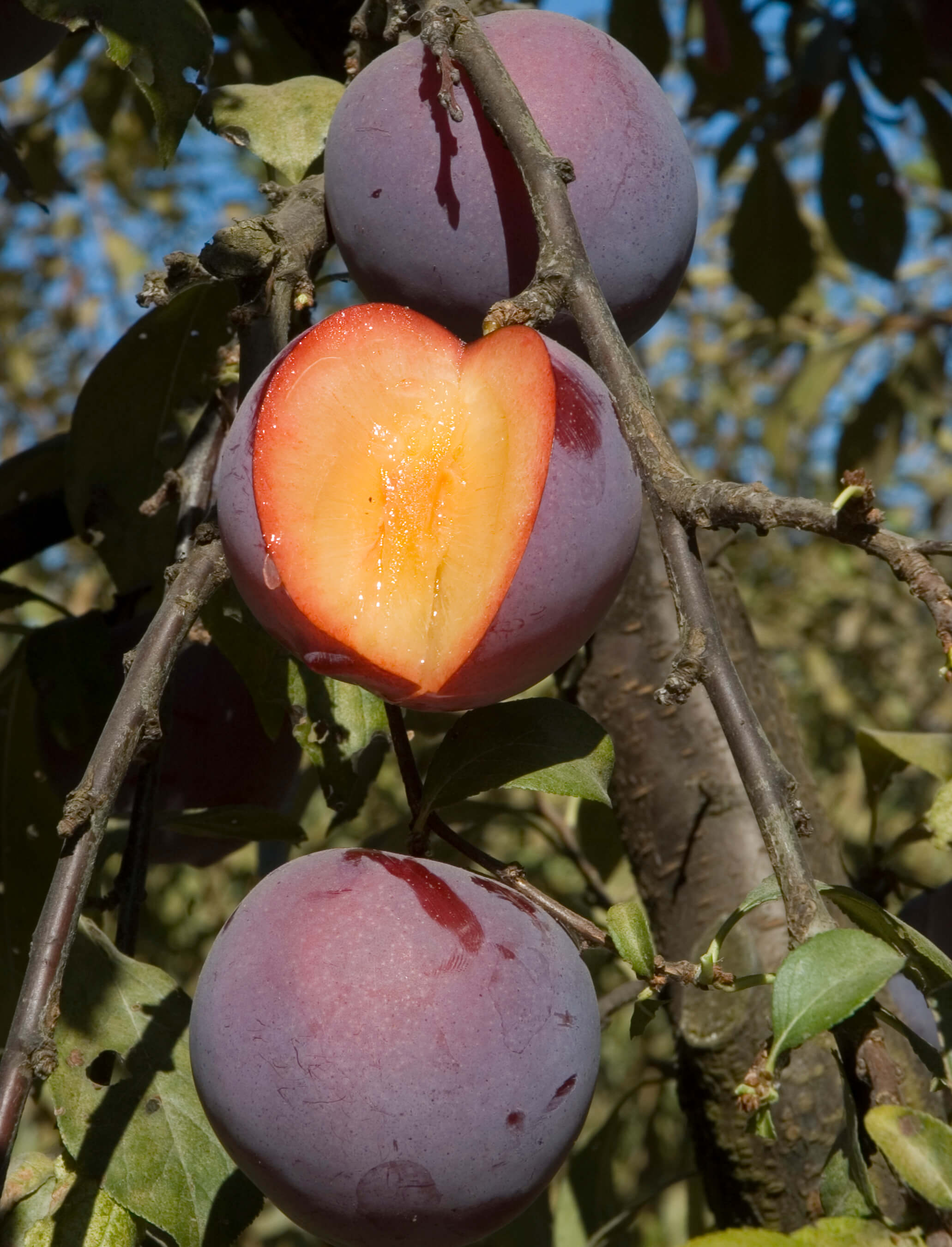 Medium to large size fruit on this new pluot with purplish red skin and amber-red flesh. Exceptional complex flavor comparable to Flavor King Pluot. Harvest begins in late August and fruit is edible well into October with excellent eating quality throughout the harvest. Zones 6 to 9. 500 hours. Pollenizer required: Santa Rosa or Burgundy plum, Flavor King, Flavor Grenade or Dapple Dandy Pluot. US Patent pending (Zaiger). Available on Myro.