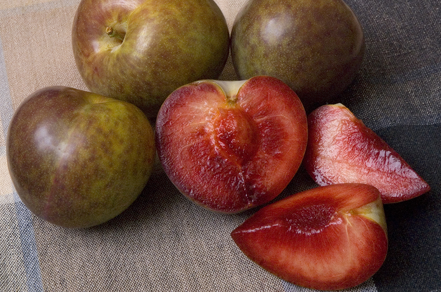 A sensational plum-apricot hybrid. Taste test winner. Medium-sized plum-like fruit has meaty, sweet, richly flavored, firm, red flesh and greenish-maroon mottled skin. No tartness. Superior to any early season plum. Ripens in June, about 2 weeks before Santa Rosa. Zones 5 to 9. 7-800 hrs. Pollenized by Flavorosa, Flavor Queen and Geo Pride Pluot, Santa Rosa or Late Santa Rosa plum or Burgundy plum. Patent no. 6763 (Zaiger). Available on Myro.